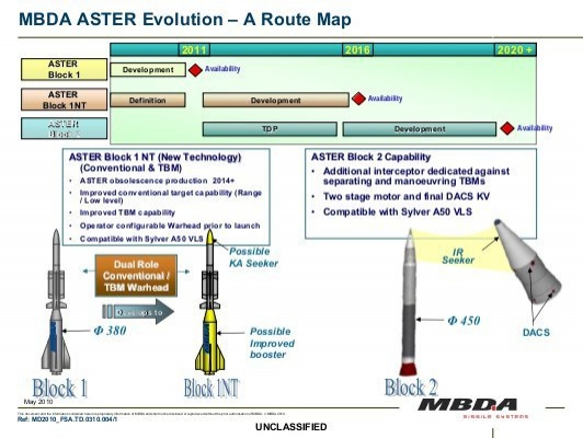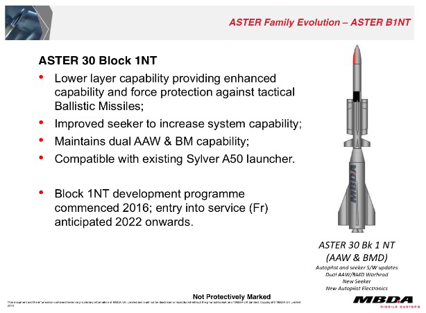 This version was created by having to cope with increasingly complex defensive needs, born from large-scale dissemination of short and medium range ballistic missiles, cruise missiles and naval surface-to-surface missiles in high field performance, not only of supersonic cruise but also with a high range, all targets particularly difficult to deal with and at present cannot be intercepted with missiles if not under certain conditions and with various types of systems. The current system ASTER 30 has an active role in NATO ALTBMD (Active Layered Theatre Ballistic Missile Defence) programme, active layered defense against theatre ballistic missile to defend Allied contingents from missile threats and as such, it represents the Italian-French contribution to this vital program.