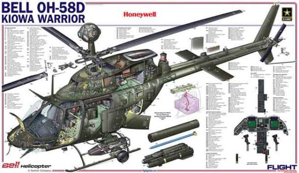 The OH-58D Kiowa Warrior is classified as an armed reconnaissance helicopter. The Kiowa’s unique features are its two external stores pylons, used to carry missiles, machine guns or rockets; and the distinctive mast-mounted sight (MMS), situated above the rotor blades which looks like a globe. The MMS enables the Kiowa to operate and engage targets day and night while minimizing helicopter exposure. The sensors in the MMS include a high-resolution television camera for long-range target detection, a thermal imaging sensor and target designators.