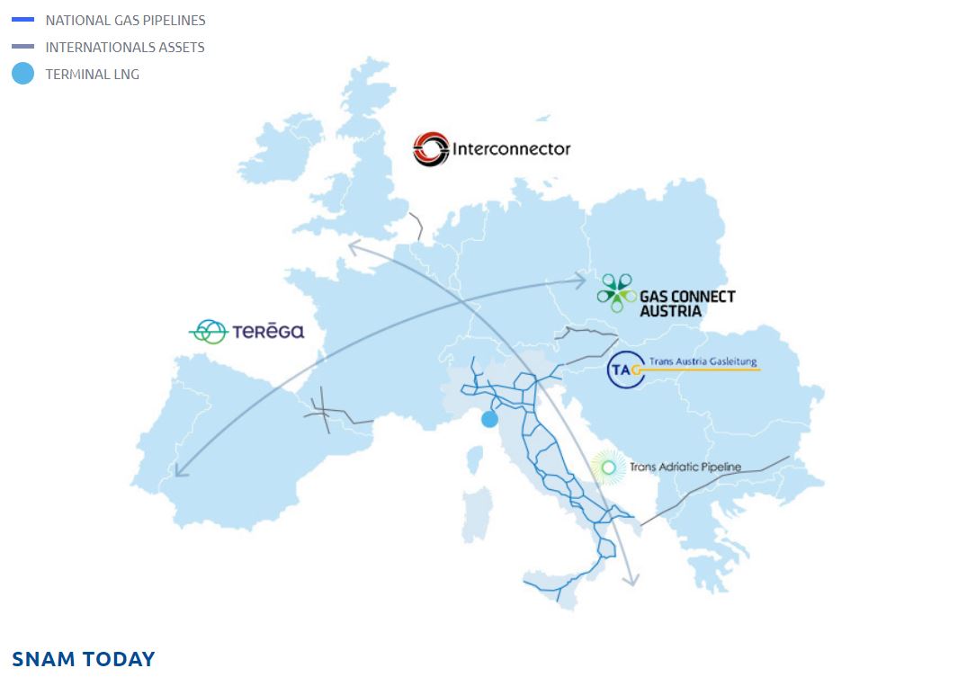 During it’s more than 75 years long history, SNAM has achieved a position of leader in Europe in the natural gas market. First in Europe by transport network size (over 32,500 km in Italy, about 40,000 Km with international subsidiaries) and Natural Gas storage capacity (16.7 bn c.m. in Italy and about 20 bn c.m. with international subsidiaries), SNAM manages the first liquefied natural gas (LNG) plant built in Italy and is a shareholder of the country’s main terminal. The company develops a comprehensive development strategy based upon its foreign subsidiaries in Austria (TAG and GCA), France (TIGF), the United Kingdom (Interconnector UK) and TAP in Greece and Albania.