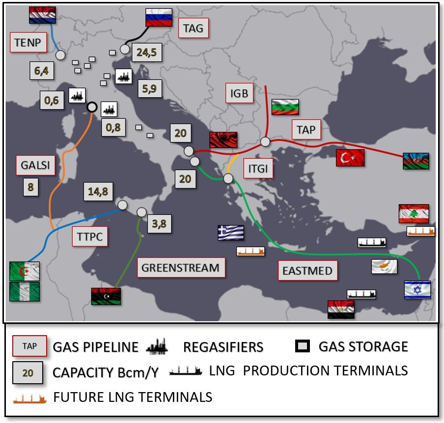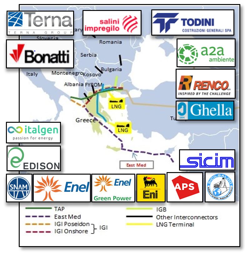 Greece confirms its position as strategic and preferred location for major and infrastructural investments, including the energy, logistics, communications and food industries. Almost all the main Italian energy players have significantly invested in Greece, where also the major EPC contractors have a strong market position. Italy and Greece signed an agreement at Corfu in 2017, to strengthen the collaboration in the field of energy, of EU goals and to improve the reliability of supplies of hydrocarbons and power. Three main natural gas pipelines will pass through the Greek territory, the TAP (Trans Adriatic Pipeline), the ITGI (Interconnection Turkey-Greece-Italy) and the EastMed via Israel and Cyprus respectively, bringing natural gas to Italy. The capacity of the three pipelines together is estimated in 30 Bcm, that makes for up to the half of the Italian consumption. ITGI and EastMed will share the IGI Poseidon pipeline.